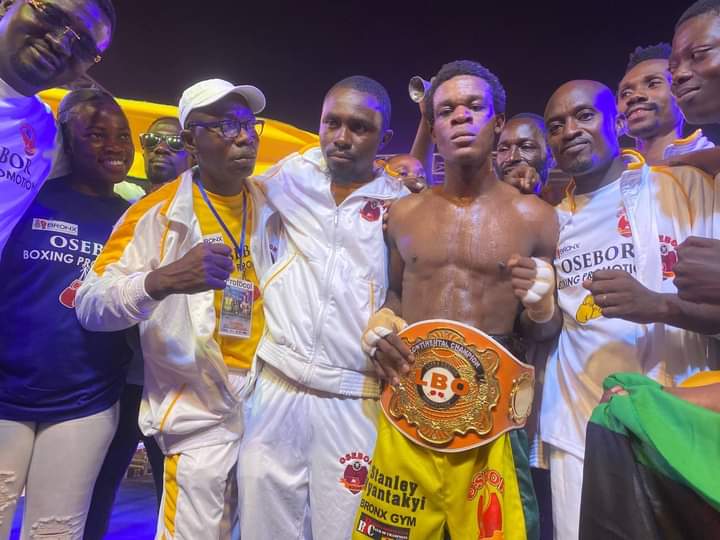 Stanley ‘Ashanti Warrior’ Nyantekyi maintained his unbeaten record as a pugilist by knocking out Komlangan Hounkpatin of Togo in round 5 in his first international fight in Accra to win the LBO Featherweight title.