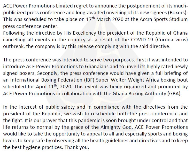 Ace Power Boxing Promotions regret to announce the postponement of their much publicized press conference at the Accra Sports Stadium and International Boxing Federation (IBF) Super Welterweight Africa boxing bout in the Volta region of Ghana on April 11, 2020.