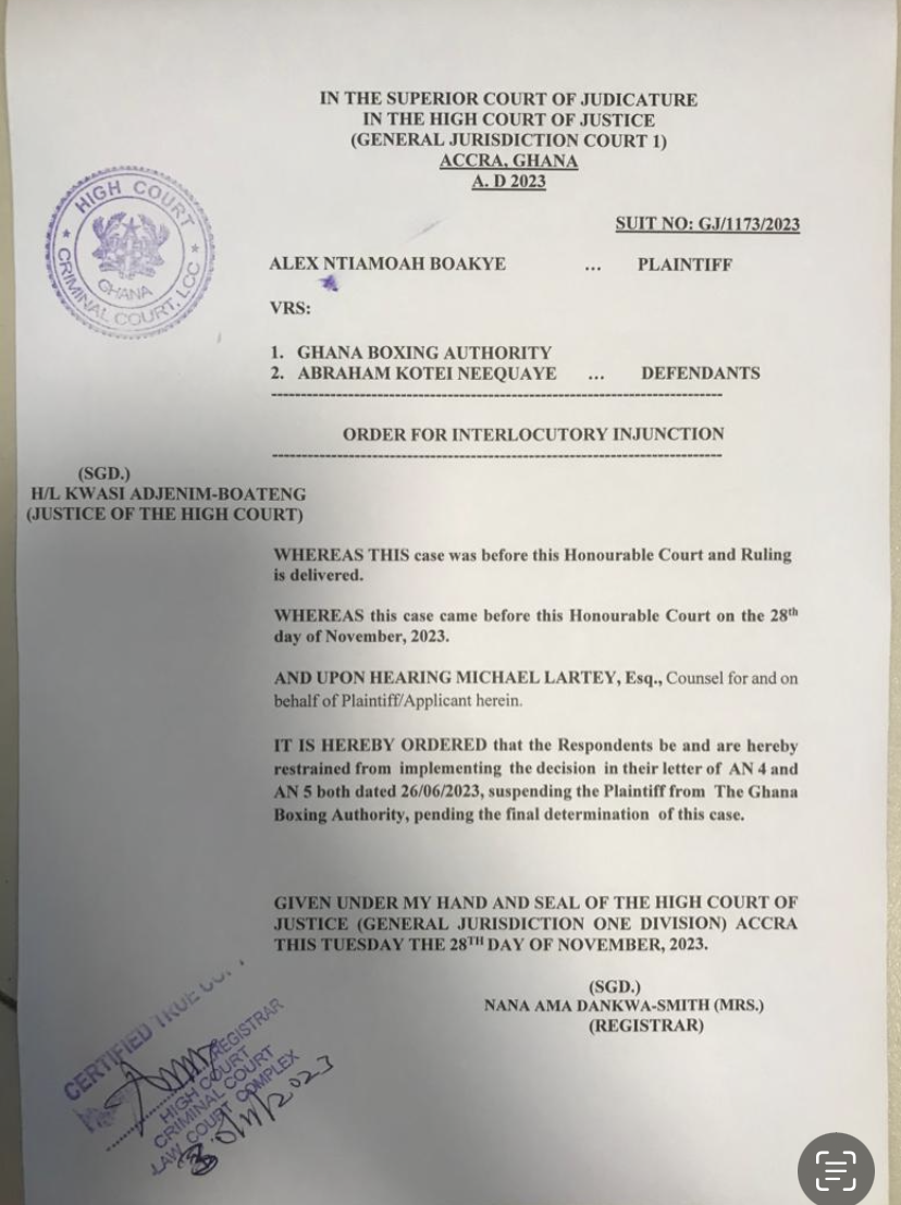 An Accra High Court has restrained the Ghana Boxing Authority (GBA) from implementing their 2 – year suspension placed on Alex Ntiamoah-Boakye and his Box Office Sports as well as S 3 Promotions.