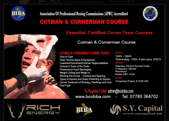 The British & Irish Boxing Authority (BIBA) have arranged an Association of Professional Boxing Commissions (APBC) Certified Corner/Cutman Course, at the Stanley Street Sports and Social Club in Worksop, Nottinghamshire on Saturday 18th February 2023, that is essential for all Coaches and Cornermen.