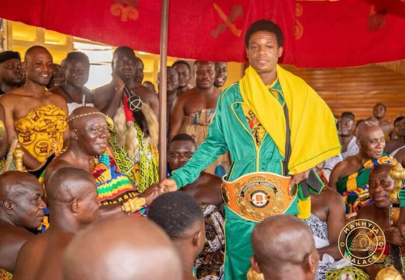The Asantehene, Otumfuo Nana Osei Tutu II has congratulated, commended and consecrated new LBO Intercontinental Featherweight Champion, Stanley Nyantakyi and his team last Sunday when they paid a special courtesy call at the Manhyia Palace in Kumasi.