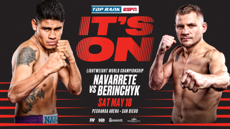 Navarrete will fight Ukrainian Olympian Denys Berinchyk (18-0, 9 KOs) for the vacant WBO lightweight world title this Saturday at Pechanga Arena in San Diego.