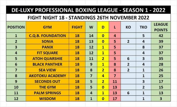 Charles Quartey Boxing Foundation maintain their grip on the top spot of the De-Luxy Professional Boxing League Table after Fight Night 18. They have won 14 of the 18 matches and featured some great boxers to amass 42 points.