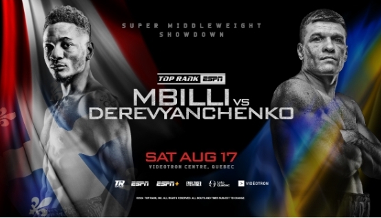 Top Rank Boxing on ESPN presented by AutoZone: Mbilli vs. Derevyanchenko, will be presented live this Saturday, August 17, at 10 p.m. ET/ 7 p.m. PT on ESPN, ESPN Deportes, and ESPN+. The event takes place at Videotron Centre in Quebec City, Canada.