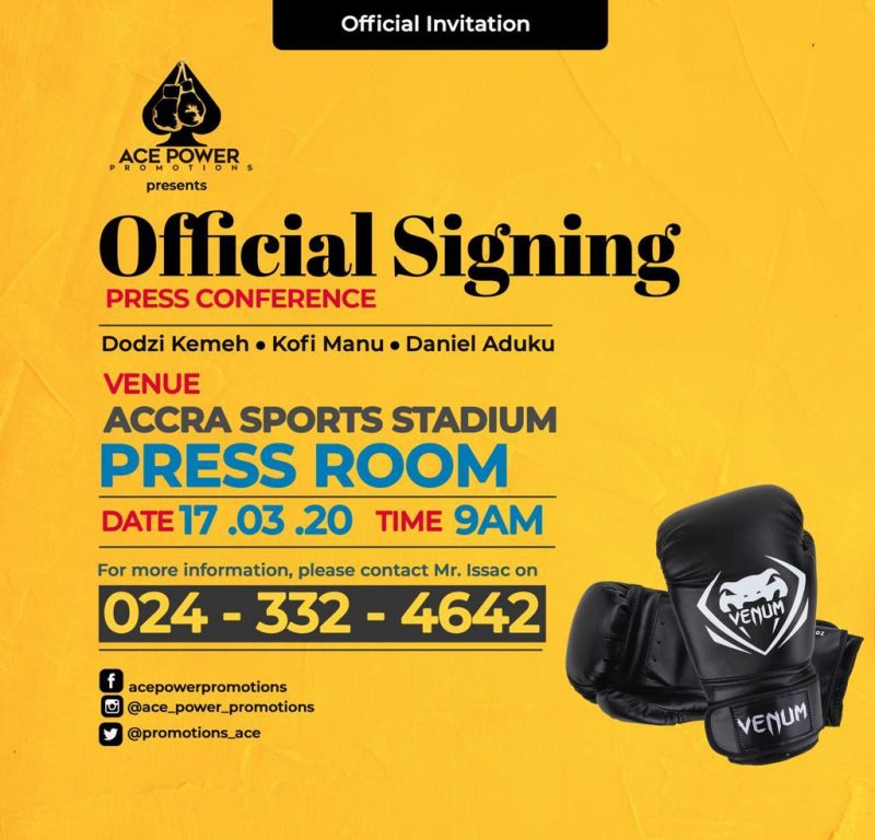 Ghana’s newest promotional hub, Ace Power Promotions are set to officially secure the signatures of Dodzi Kermeh, Kofi Manu and Daniel Duku at the Accra Sports Stadium Press centre on Tuesday, the 17th day of March, 2020.