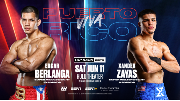 “Boxing events at Madison Square Garden on the eve of the Puerto Rican Day Parade are always special, and we have sensational young talents in Edgar Berlanga and Xander Zayas topping the bill,” said Top Rank chairman Bob Arum. “They are each stepping up in class, and I expect them to perform in a big way in front of a raucous, sold-out arena.”