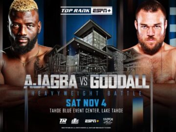 Nigerian contender Efe Ajagba (18-1, 13 KOs) is set to face upset-minded Australian Joe Goodall (10-1-1, 9 KOs) in a 10-round heavyweight attraction this Saturday, Nov. 4 at Tahoe Blue Event Center in Lake Tahoe, Nevada.
