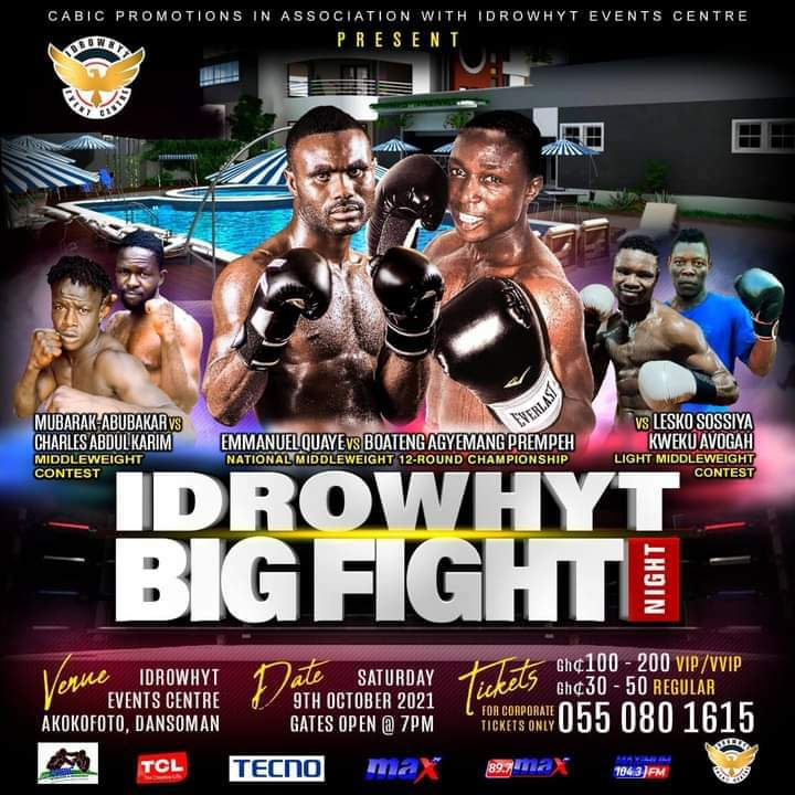 The much anticipated national middleweight championship dubbed ‘Big Fight Night’ involving Emmanuel Quaye and Boateng Agyeman is set to take place on Saturday night at the Idrowhyt Event Centre in Dansoman, Accra.