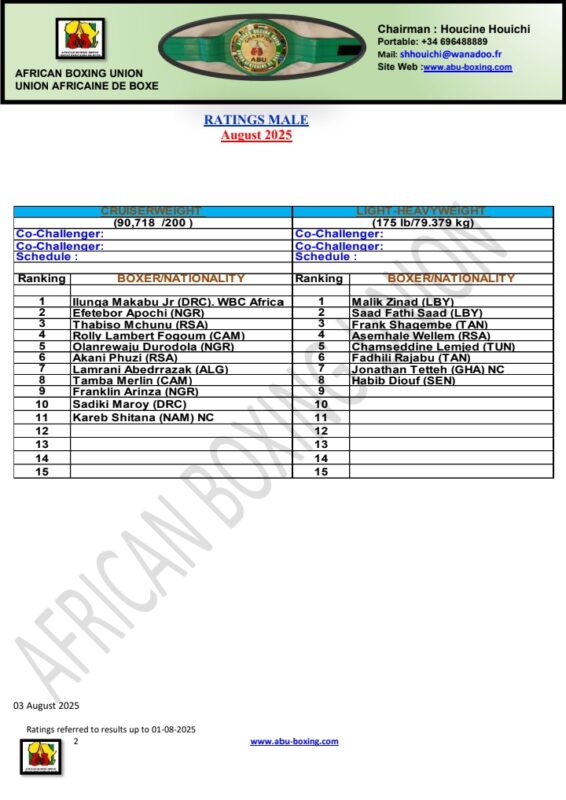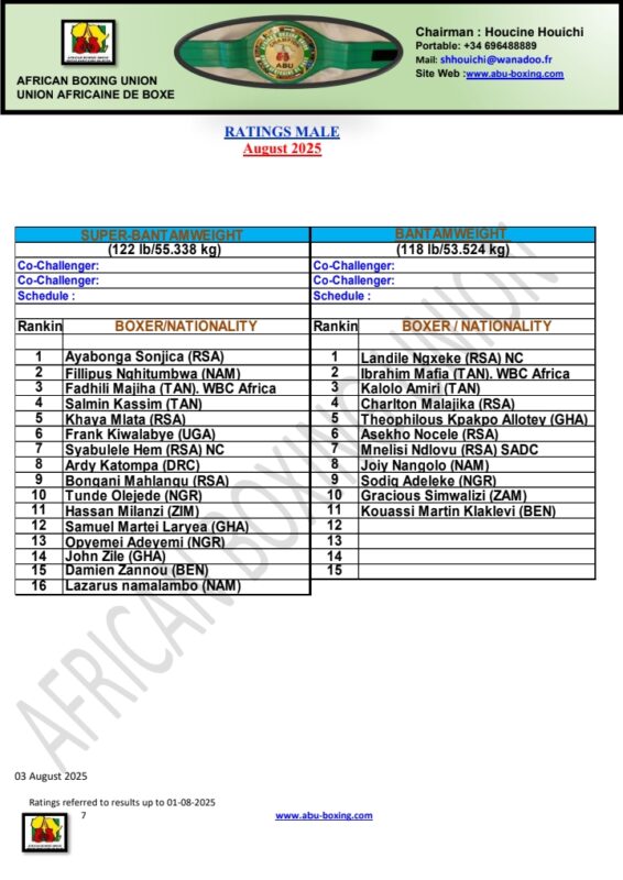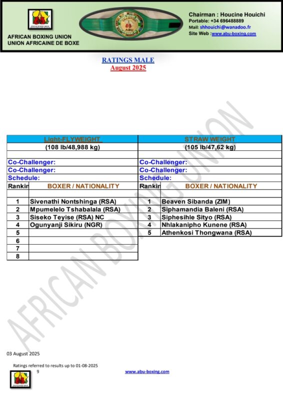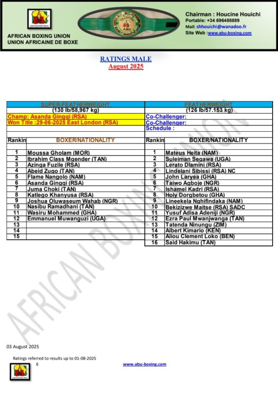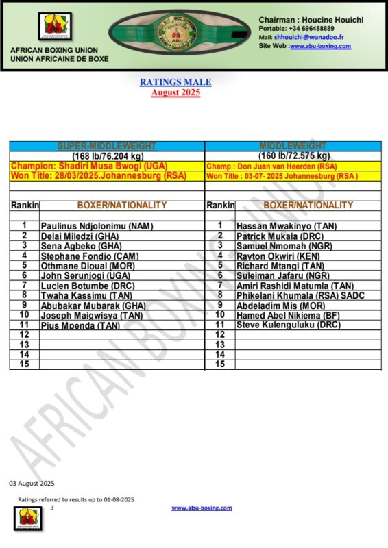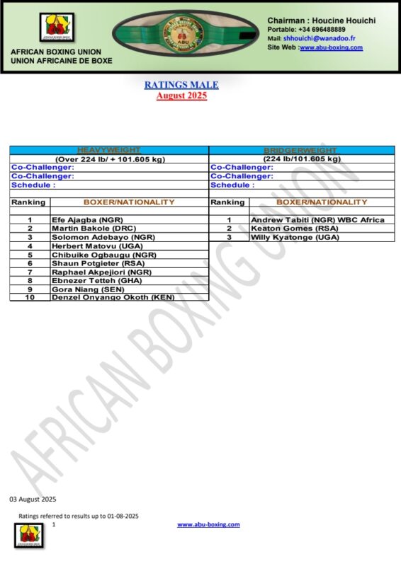 African Boxing Union (ABU) has released its full ranking for the month of August, 2025. The ranking which was released on Monday, August 4, covers from Strawweight (105lb) to the Heavyweight division (224lb+).