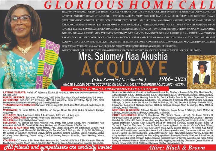 According to family sources, she will be buried at Mamponse Royal Cemetery on February 18, after service at the Mount Zion Methodist Church at Korle Gonno.