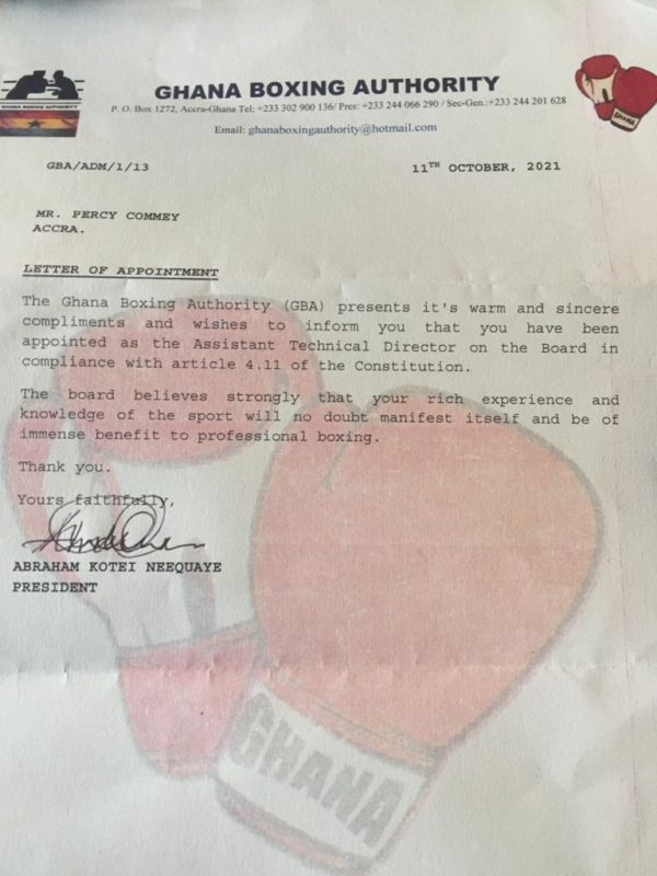 “The Ghana Boxing Authority(GBA) presents its worm and sincere complement and wish to inform you that you have been appointed as Assistant Technical Dorector on the board in compliance with article 4.11 of the constitution”, the letter read.