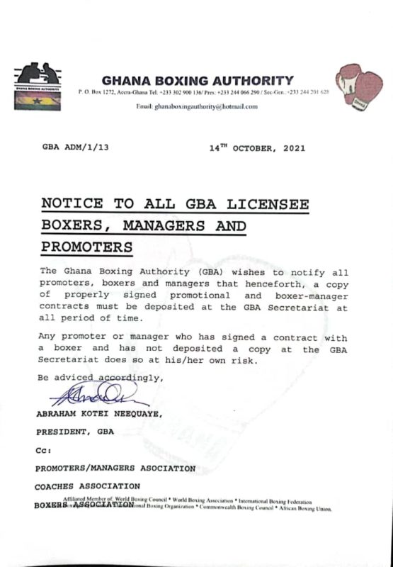 The Ghana Boxing Authority(GBA) has notified all licenced professional boxers, promoters and managers to furnish them with copies of signed promotional and boxer-manager contracts at all times.