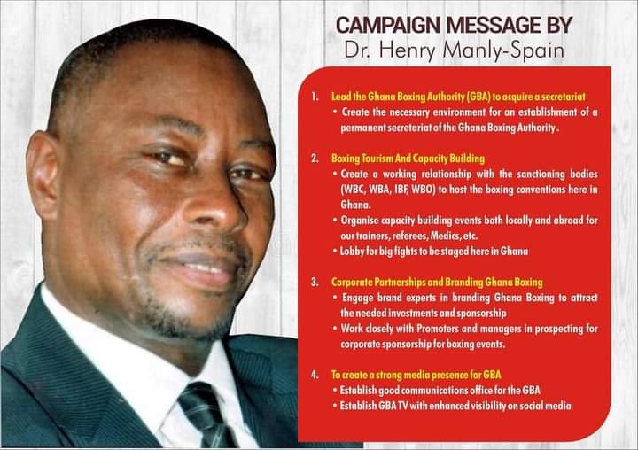 To make his intention about the new position he is vying for reach the stakeholder who have the power to make or unmake his presidential ambition, Dr. Manly-Spain has drafted a message detailing what his ambitions are for the Ghana Boxing Authority should he be voted as the next president in the next 9 days.