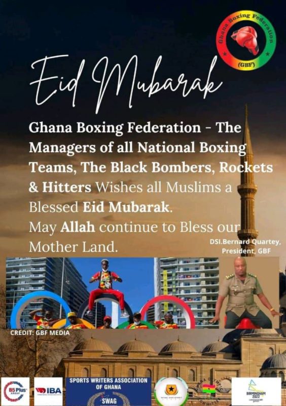 “Ghana Boxing Federation, the managers of the national Boxing Teams, Black Bombers, Rockets & Hitters wishes all Muslims a Blessed Eid Mubarak. May Allah continue to Bless our Motherland.”