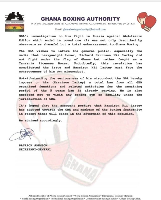 According to the new punishment contained in a GBA communique, Lartey must never be seen anywhere near a boxing gym in Ghana or be engaged in any GBA sanctioned event anywhere.