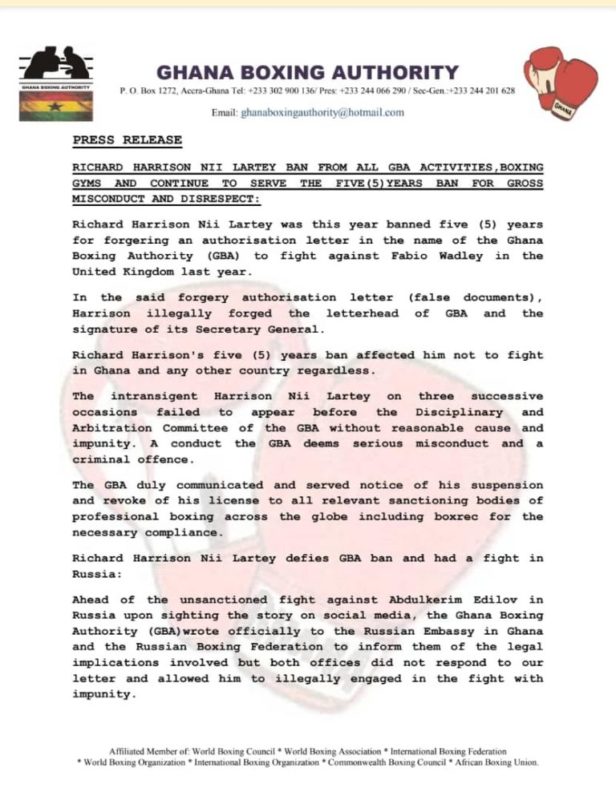 Ricahrd Lartey was handed a five-year ban by the Ghana Boxing Authority for forgering an authorization from the Authority to fight Fabio Wadley in the United Kingdom last year.