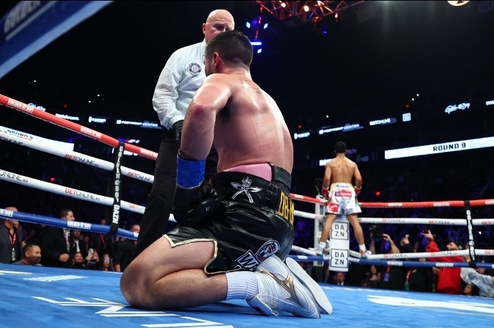 A straight right by Munguia sent Ryder to the canvas, through the bottom two ropes, with 1:54 to go in the second round. A stunned Ryder reached his feet quickly, by the time Melton counted to four, and took Munguia’s power better for the remainder of the second round.