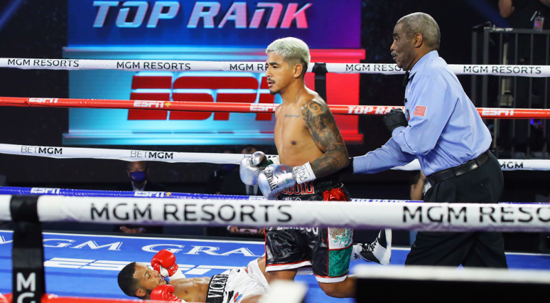 LAS VEGAS (June 12, 2020) — There were fouls, multiple point deductions and knockdowns. But for featherweight Jessie Magdaleno, the win is all that mattered. Magdaleno prevailed over Yenifel Vicente via disqualification in the Top Rank on ESPN main event Thursday evening from the MGM Grand Conference Center — Grand Ballroom in Las Vegas.