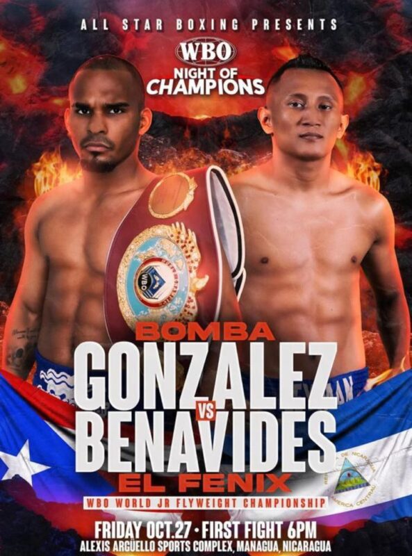 WBO junior flyweight titlist Jonathan “Bomba” Gonzalez (27-3-1) of Caguas, Puerto Rico is set to make his third defense against local ranked challenger WBO #10 Leyman “El Fenix” Benavides (20-6-1) on October 27th from Alexis Arguello Sports Complex in Managua, Nicaragua.