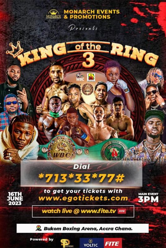 Monarch Events and Promotions is about to illuminate the shores of Ghana, to be precise, the Bukom Boxing Arena, Accra with a Super power-packed boxing event dubbed “King of the Ring 3” on the 16th of June, 2023.