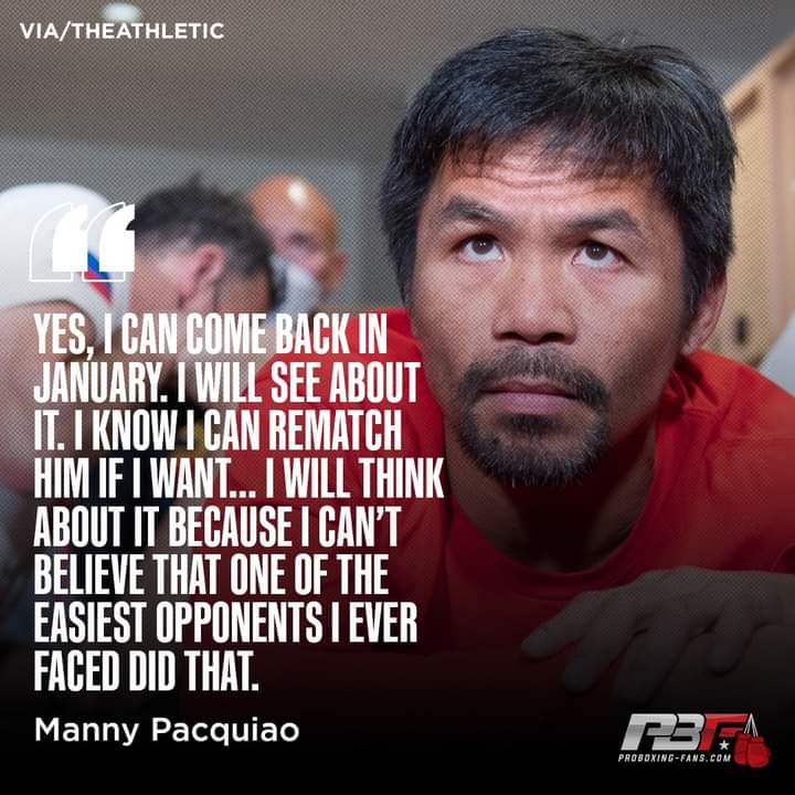 In a post sited on social media, the 8 division champion Manny Pacquiao stated, “Yes, I can come back in January, I will see about it. I know I can rematch him if I want. I will think about it because I can’t believe one of the easiest opponents I ever faced did that.”