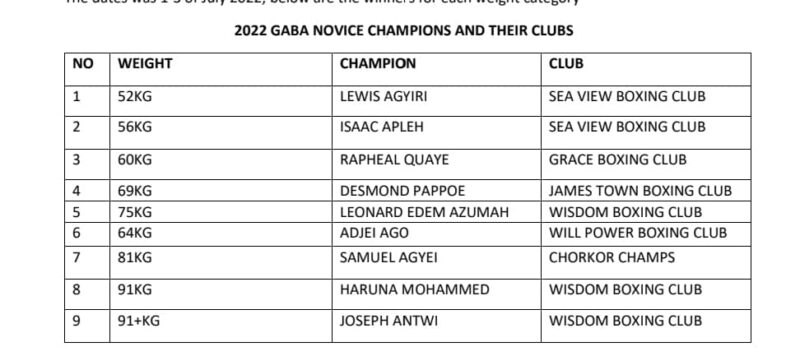 The 2022 edition of the GABA Novice tournament attracted 40 boxers from 12 clubs within the Greater Accra Region. The competition was open for 13 weights classes. However, only 9 weight classes competed.