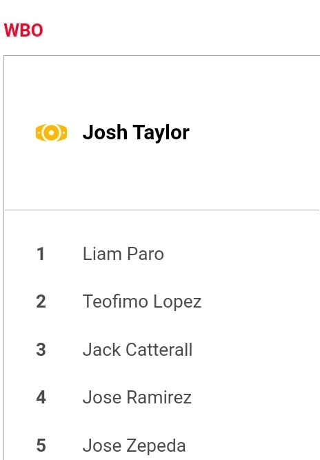 “Considering that Teofimo Lopez, Jack Catterall, and Jose Carlos Ramirez are indispensable parties to this matter, it is hereby ordered that the parties herein submit in writing to the WBO within 72 hours upon issuance of this notice their respective arguments and supported evidence as to why the WBO Ratings Committee shall grant your requests.”