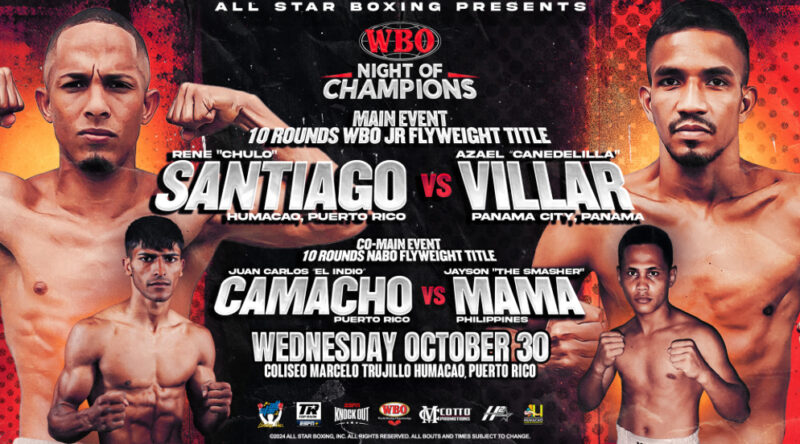 Former light flyweight world title challenger Rene Santiago faces Panamanian contender Azael Villar in the 10-round main event this Wednesday, Oct. 30, at Coliseo Marcelo Trujillo Panisse in Humacao, Puerto Rico.