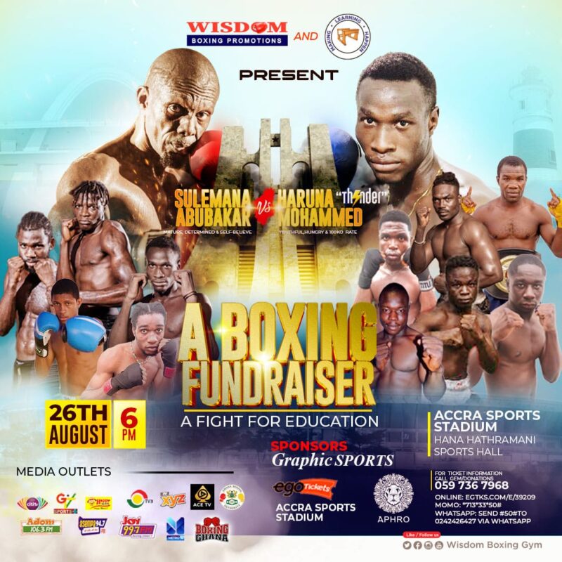 Wisdom Boxing Gym in collaboration with Making Learning Happen [an NGO which seeks to equip underprivileged schools with learning facilities] is set to stage a boxing event on August 26 at the Accra Sports Stadium, precisely at the Hana Hathramani Sports Hall.