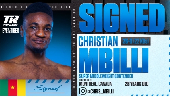 Undefeated super middleweight contender Christian Mbilli, the Cameroon-born, Montreal-based wrecking ball, has inked a long-term co-promotional agreement with Top Rank, who will work with Eye of the Tiger.