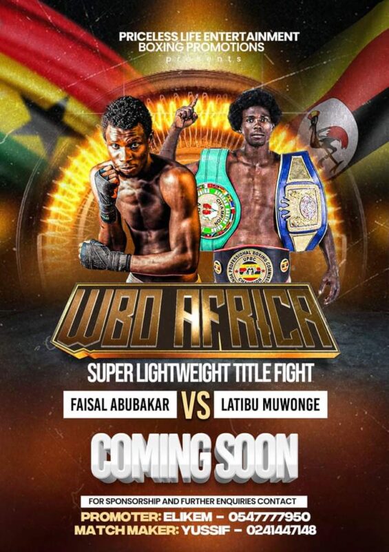 Faisal Abubakari (15-0-13kos) of Ghana will mount the ring against undefeated champion from Uganda Latibu Muwonge (8-0-0) for the WBO Africa Super Lightweight Championship here in Accra, Ghana.