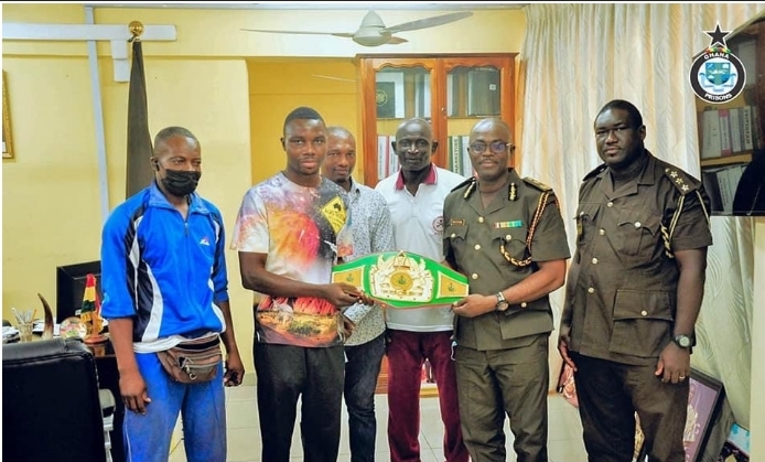 Corporal Musah Lawson has today the 3rd of February, 2022, presented the National Super Welterweight Boxing Title to the Director General of Prisons Mr. Isaac Kofi Egyir at the Prisons Headquarters in Accra.”